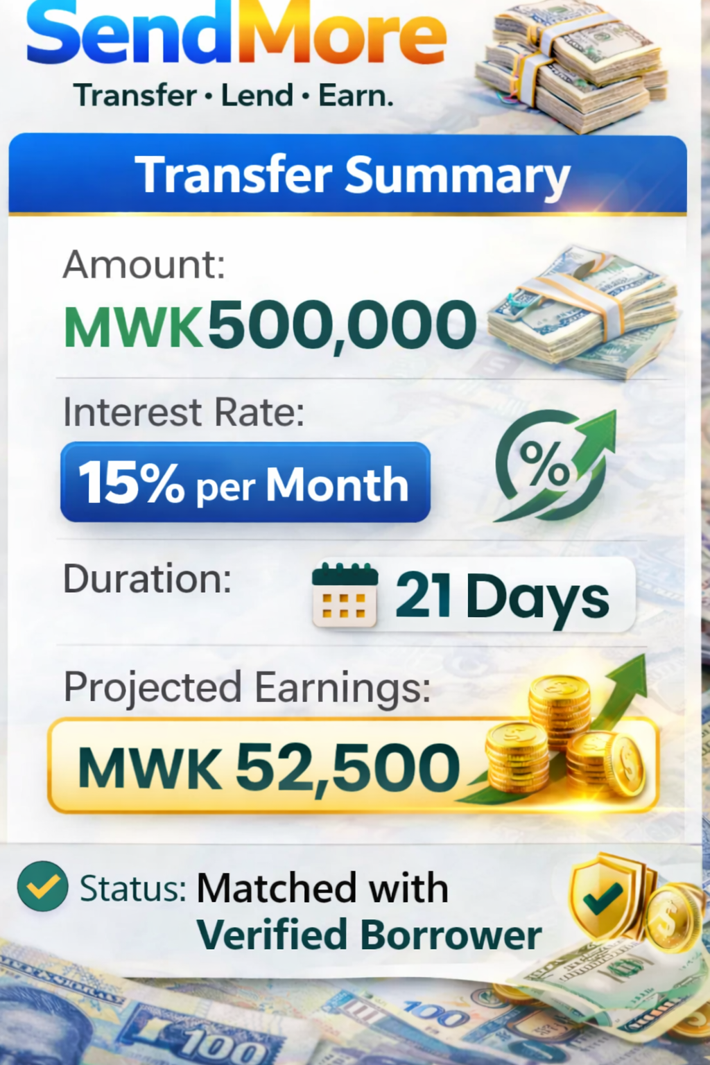 Transform money transfers into short-term lending opportunities. Choose your interest rate. Choose your duration. Get paid.
